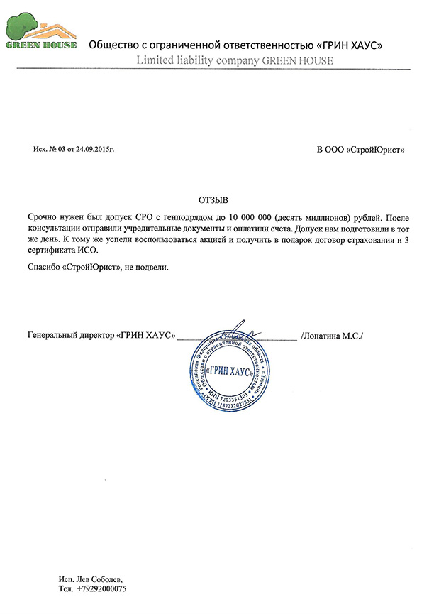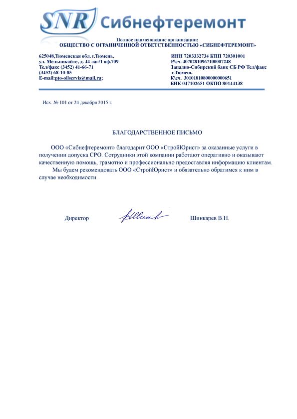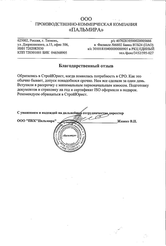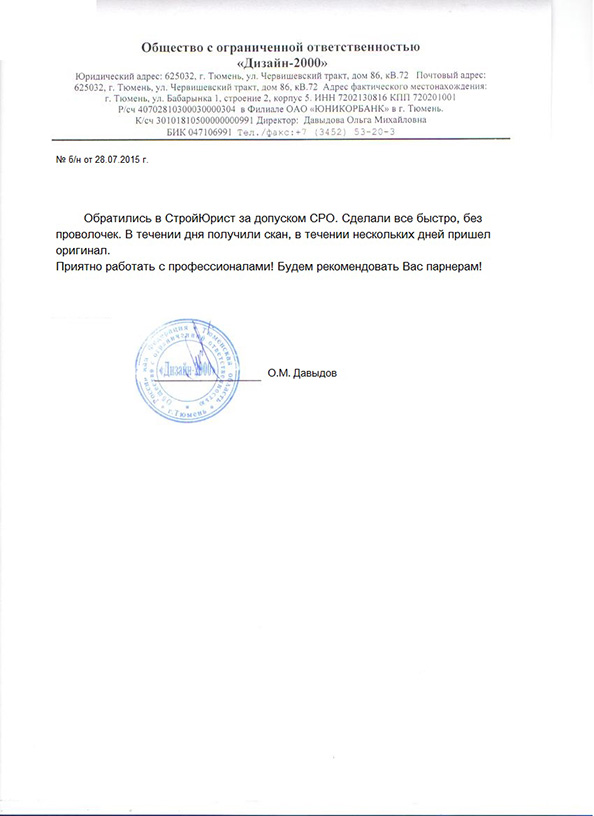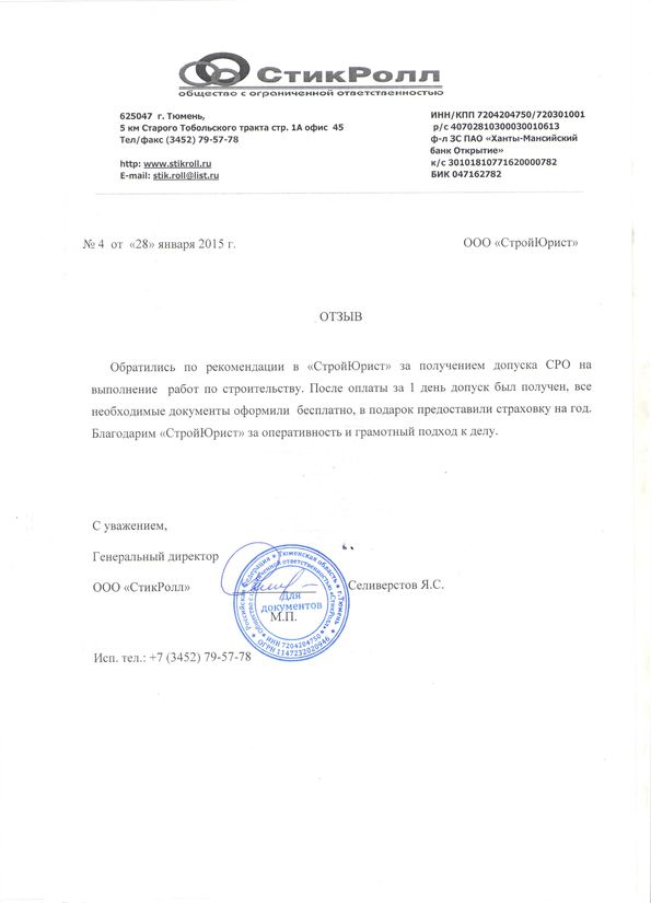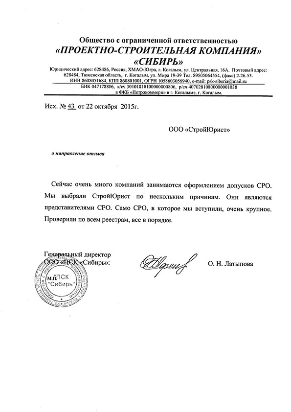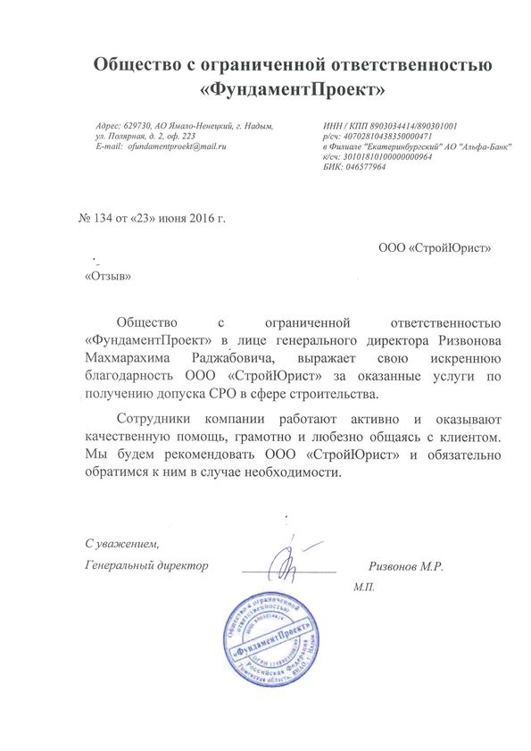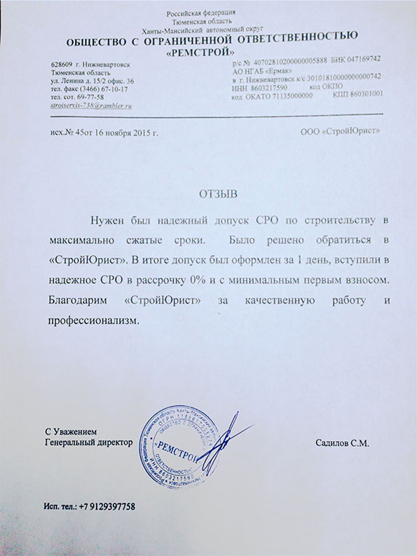 Отзывы клиентов "СтройЮрист" по вступлению в СРО в Новом Уренгое